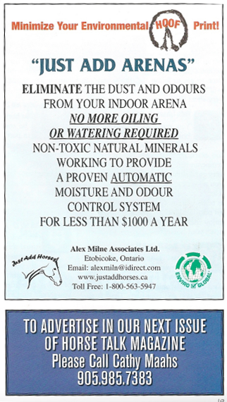 Simply spreading a totally natural mineral and organic product and allowing the horses to work it into the footing is the ultimate in dust control. This Canadian made product combines zeolite, magnesium and an organic substance to automatically control the moisture in the footing.